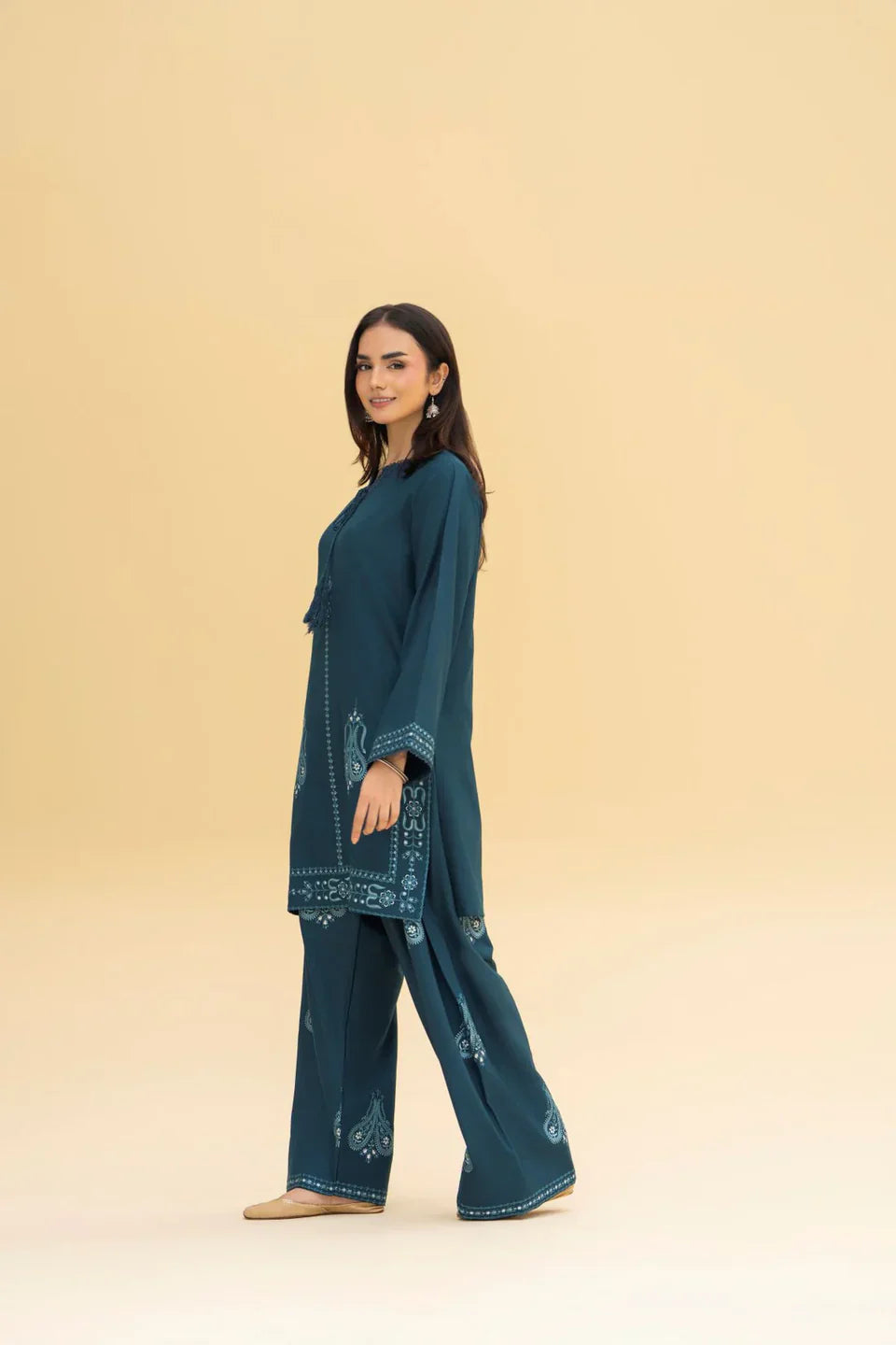 Crafted in premium Marina fabric, this zinc-colored embroidered shirt paired with a beautifully detailed farshi shalwar from Dhanak embodies modern grace with a traditional touch. The intricate embroidery enhances its elegance, making it perfect for festive and winter soirées. The model is wearing size Small, showcasing the refined fit and timeless silhouette of this ensemble, which exudes understated luxury and charm.