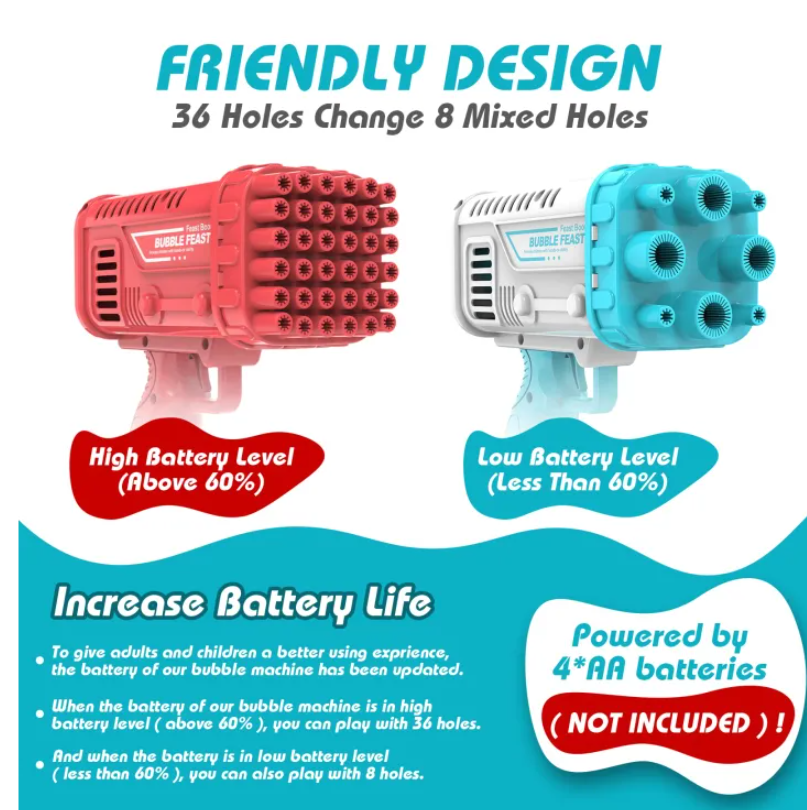 Equipped with multiple bubble holes, this bazooka-style bubble gun produces a continuous stream of bubbles, filling the air with magic and joy. It’s lightweight, easy to use, and designed for safe play, making it the ultimate outdoor toy for children and families.